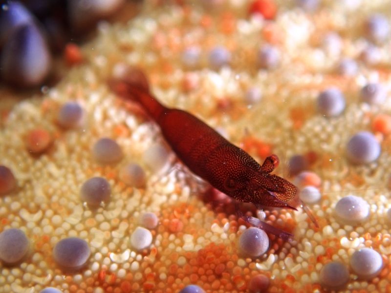 ヒトデ類をお家にする小型のエビです。大きくても1.5cmぐらいなので実物をご覧頂くときはよ~く目を凝らして頂きます(笑)。写真で見ると眼球や体の模様までハッキリ!更にヒトデの表面もクッキリで「異世界感」が凄いですね~!