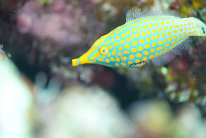 まず最初に出会ったのはテングカワハギ。サンゴの上をちょこちょこと移動しながら、夢中でエサをついばんでいる姿がとても愛らしい。水色の体にオレンジのドット模様が本当に鮮やかで、見ているだけでテンションが上がる魚です。ペアでいることが多いこの子たち、今日も仲良く寄り添って泳いでいました。