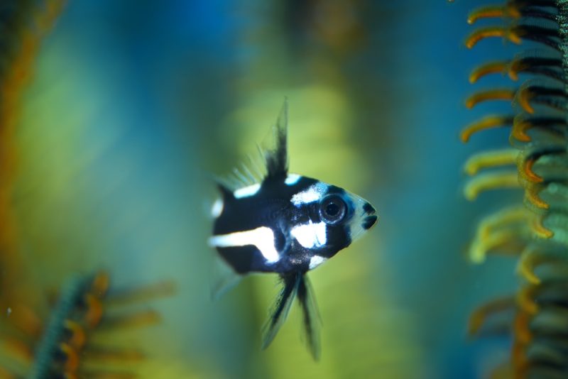 そしてラストはホホスジタルミの幼魚♪成魚とはまるで別物のような姿で、黒地に白のラインがくっきりと映えます。ひらひらと泳ぐ様子がまるでリーフの中の舞踏家のようで、見ていて飽きません。成長とともに体色が変化していく魚のひとつで、今のこの姿はまさに一瞬の美しさ。