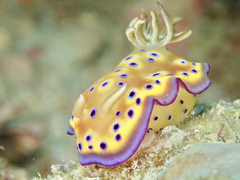 そしてラストに登場したのは、こちらも色鮮やかなオトヒメウミウシ!青紫の斑点が並び、周囲はパステルカラーの縁取り。水中でもかなり目立つ存在です!居てくれると嬉しくなっちゃいますね!今日も可愛らしい生き物に出会えた一日でした♪それではまた!
