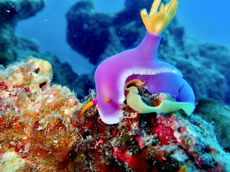 岩陰に目をやると、鮮やかな紫がパッと目に入ってきました!そう、シンデレラウミウシです♪まだまだ健在です。湾内ポイントの名物的な大きな個体です。ぽてっとしたフォルムがイイですね~♪