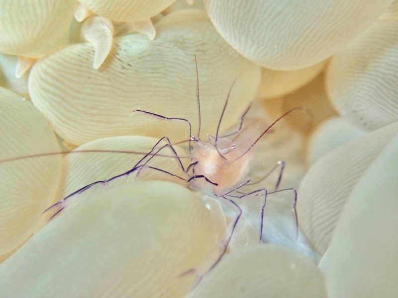 まず最初に目に飛び込んできたのは、バブルコーラルシュリンプ♪バブルコーラルのぷくぷくしたポリプの隙間にひっそりと身を潜める、とても小さなエビです。体はほぼ透明で、脚には薄紫のラインが入り、光に当たるとキラリと輝く宝石のよう。バブルコーラルの中でクリーニング行動を行う姿も観察できて、カメラで撮るにはもってこいの生き物です!