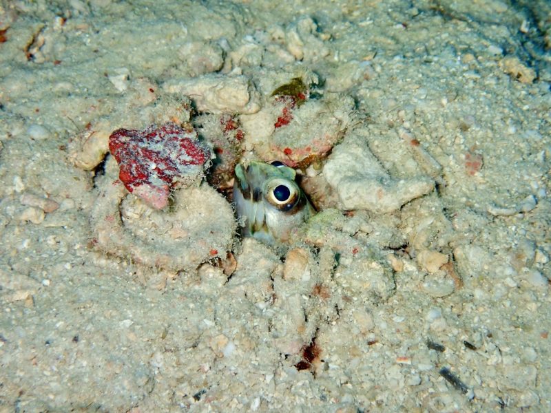 続いてはクリックリの目をしたリングアイジョーフィッシュ!大きな目のリング模様が特徴的なジョーフィッシュの仲間です。砂地に穴を掘って巣を作り、顔だけひょこっと出して周囲を見てる姿がとても愛らしい。意外と近くまで寄ることができますよ!