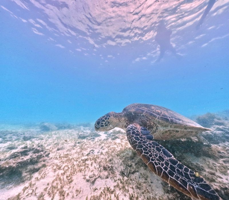 ウミガメシュノーケルで使ってるビーチも濁り気味でしたが、エントリーするとすぐにアオウミガメの姿が。草をはむようにゆっくりと動く姿がとても穏やかで、そんな姿にスタッフも含めてみんな癒やされてました。