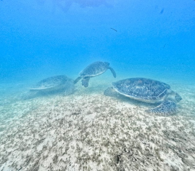 その少し先には2匹目と3匹目のカメが一緒に泳いでおり、最終的には3匹とも合流してましたwこんなにもいっぱいウミガメが見れる場所もなかなか珍しいと思います!仲良く海藻を食べてて可愛らしいですね♪