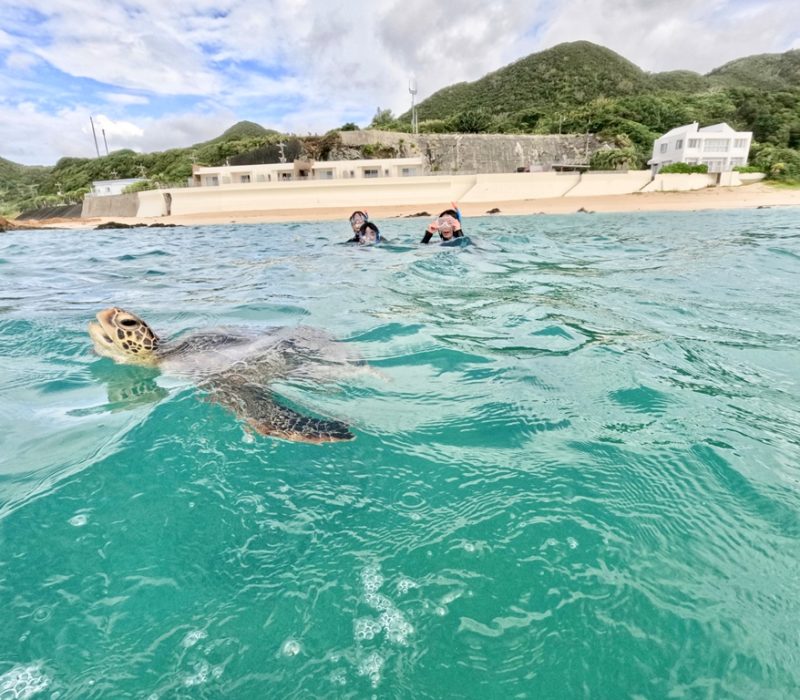 最後は息継ぎしに水面近くまで上がってきたカメと間近で泳ぐことができて皆さん大興奮。ゆっくりと息継ぎをする姿もとても可愛らしいんですよ~~♪皆さんもウミガメシュノーケルに参加した際は息継ぎのシーンにも注目です。そんなウミガメシュノーケルは年中開催してます。また次回も出会えますように!