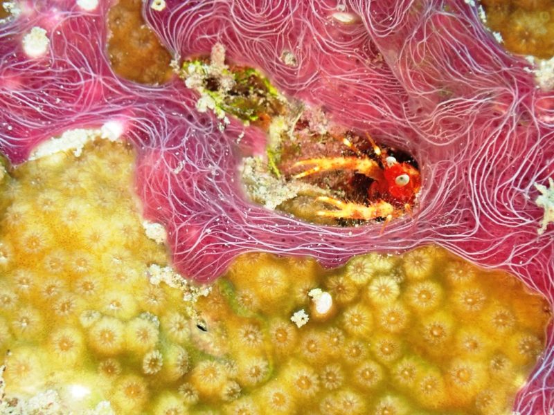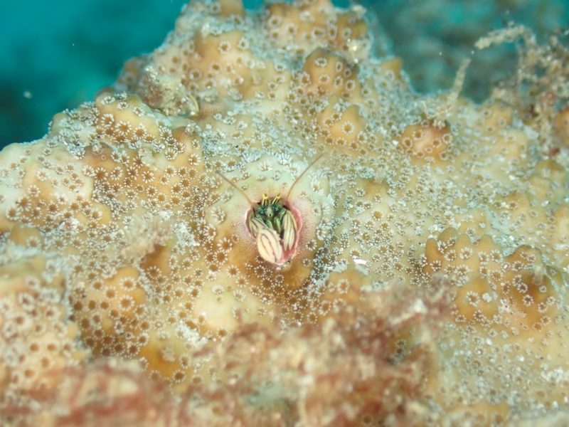 カンザシゴカイの仲間がつくった石灰質の棲管に住んでいて、いつも顔やはさみだけを出しています。こちらも穴の中から「こんにちは~」って感じで可愛いですね~。
