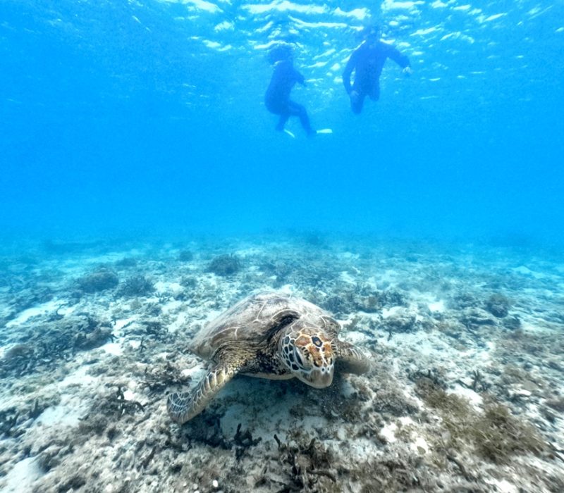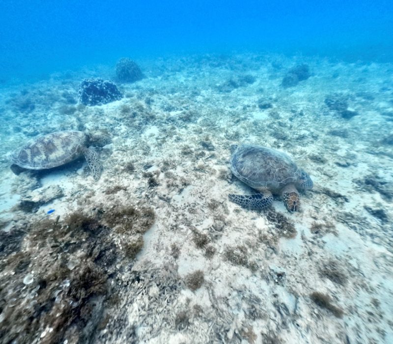 比較的ウミガメが多いビーチなのでウミガメとの遭遇率はとても高いです。運が良いと複数で居ることも!ウミガメは基本的には単独行動ですが、たまたま二匹近くにいると仲良く食事してるみたいで可愛いですね♪