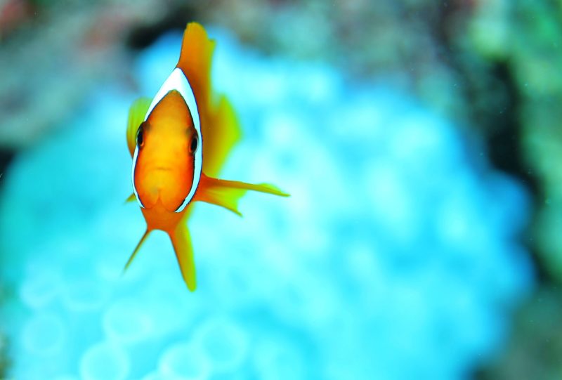 白化したイソギンチャクにオレンジが映えます。「ハマクマノミ」