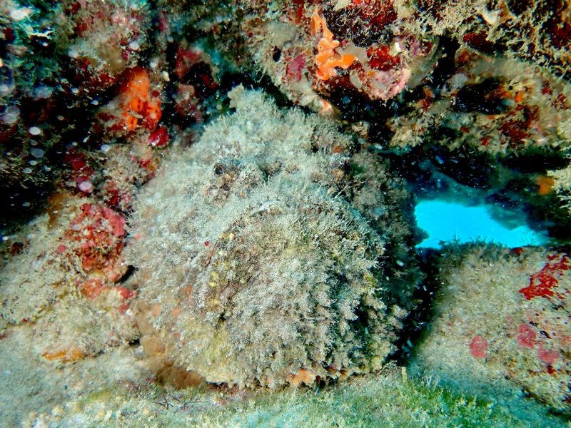 岩のくぼみを覗くとオニダルマオコゼ♪どこに居るかわかりますか??正解はど真ん中で正面を向いてます!まるで岩みたいに鎮座するオニダルマオコゼですがよく同じ所に居るのでもしかしたら居心地良くてお気に入りの場所のかな?そう思うといかつい顔もなんだか可愛らしく見えてきます。