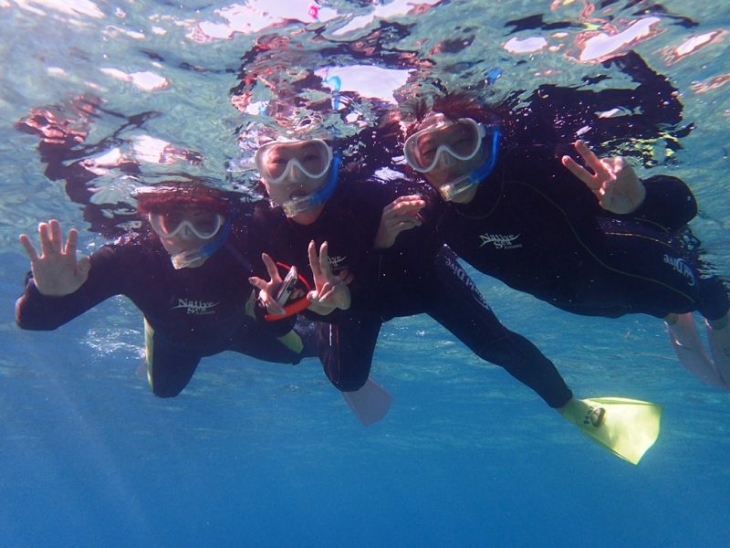 ご集合時に「ウミガメ見たいです~」とのリクエストを頂いた仲良し女子3人組のお客様。余裕のポーズで写真撮影にも応じて頂きました♪