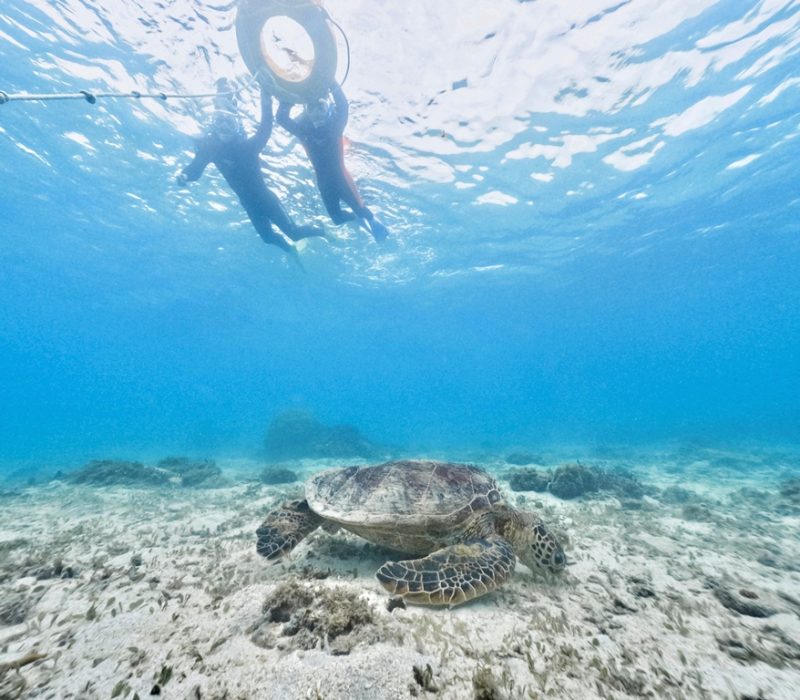さらに、今日のような浅瀬では、砂地でモグモグと食事中のアオウミガメに出会えることが多いです。ここの子たちは海草(ウミヒルモなど)を主食とするベジタリアン。毎日体重の数%を食べなければならないので、ゆっくり見えて実は忙しい生き物でもあります。