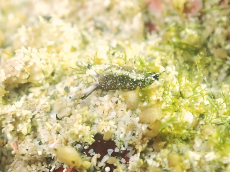 浅場の砂地では、チャマダラミドリガイがゆっくりと移動する姿を発見♪小さな体に細かな模様が入り、じっと観察していると意外と存在感のある子でした。周りの海藻に紛れてしまいそうな色合いですが、その可愛らしい動きに思わずカメラを向けてしまいます。