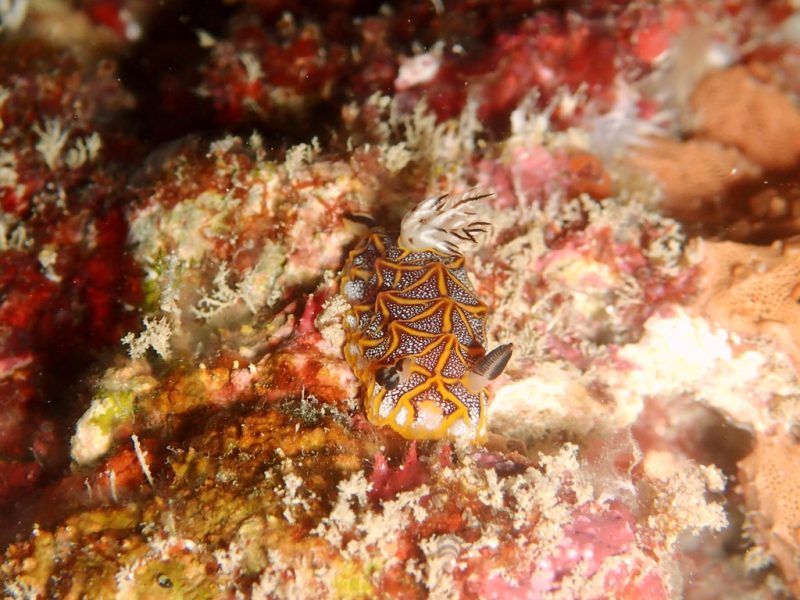 岩場ではモザイクウミウシが登場。名前の通り複雑な模様が全身に広がり、ライトを当てると模様がくっきり浮かび上がります。水温が下がってきてウミウシたちがどんどん増えてきてるような気がします!これからが楽しみですね✩