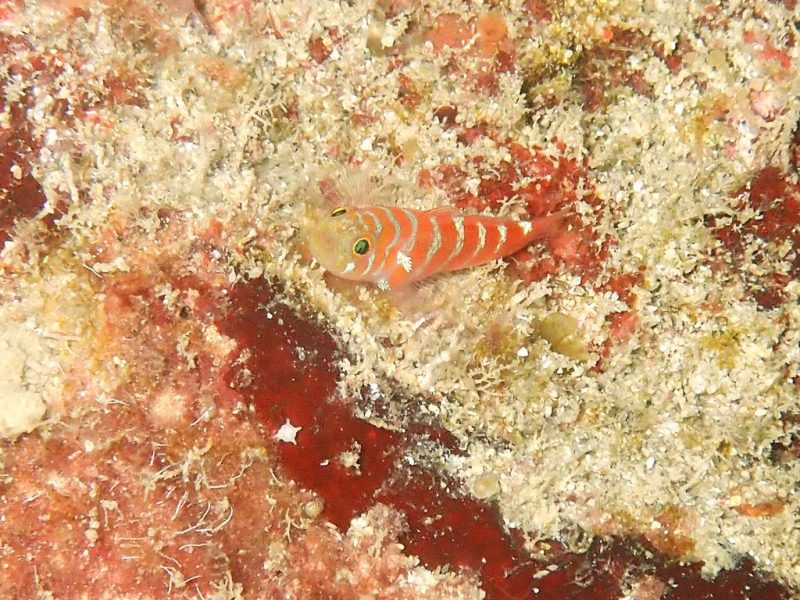 最後はシマイソハゼ♪赤と白のストライプがとても鮮やかで小さな岩陰からこちらをじっと観察するような表情がかわいらしい魚です。動きは素早いのに、時折ぴたりと止まってポーズを取ってくれるので、写真にも撮りやすいタイミングがありました。今日も奄美の海は、小さな生き物たちの魅力に満ちていました。明日はどんな出会いがあるのか楽しみです!