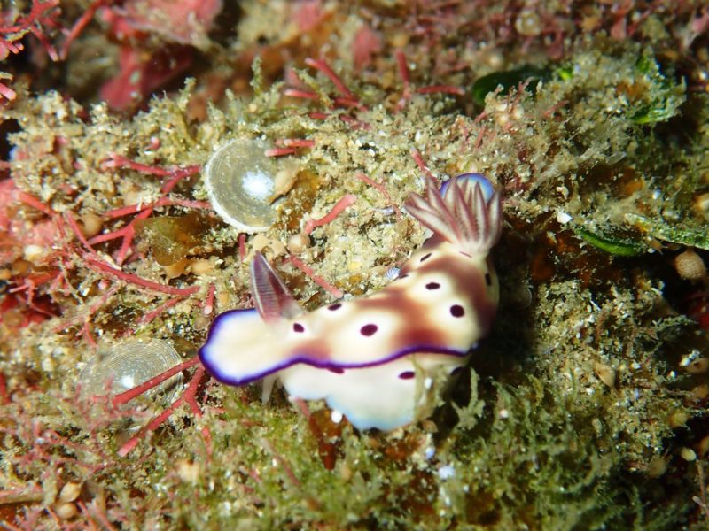 冬から春先にかけて観察できるウミウシです。 名前の通り、まだら模様が特徴。 外套膜の紫色が綺麗です。