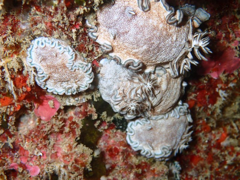 モンジャウミウシと同様に、海綿を食べるようで、たまにこうやって同じ場所に複数匹が集まっています。そしてこのまま交接する流れのようでした。