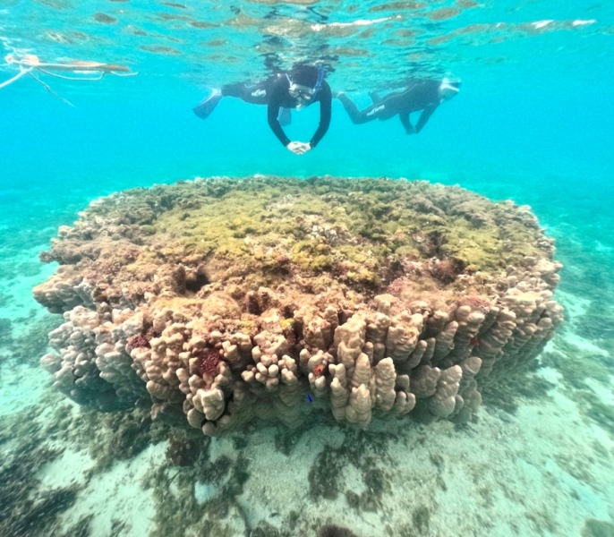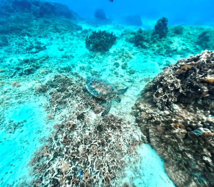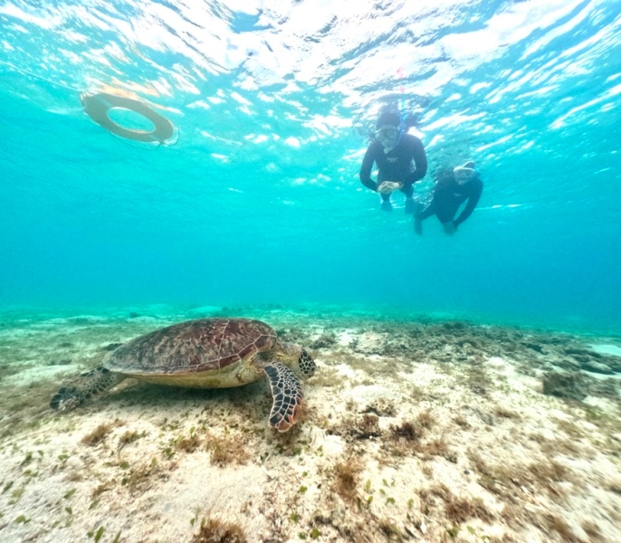 エントリーしてしばらくするとのんびりモードのアオウミガメが登場。岩陰で休憩したり、ゆっくり泳いだりする姿を、距離を保ちながらじっくり観察できました。今日は合計2匹のアオウミガメに出会えて、ゲストのお二人も終始とても癒されている様子♪