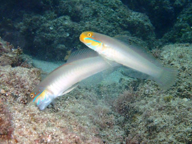アカハチハゼ。頬のブルーのラインがとっても綺麗です!ガツガツと砂の中をほじくっては鰓で砂をこしていました。