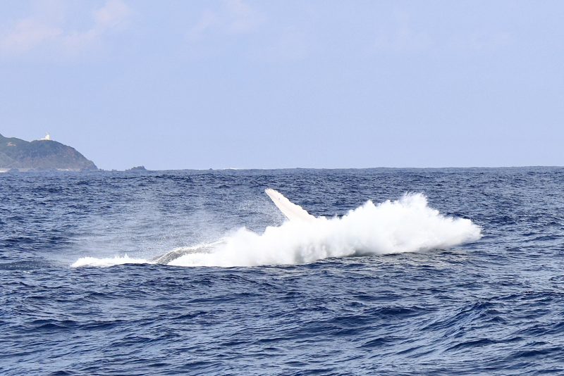 はい!ド~ンです!!遠くに見える灯台までくっきりと見渡せる絶好のウォッチング日和!!体長15m前後・体重約30トンを超える巨体が海面から勢いよく飛び出し、激しい水しぶきを上げて着水する豪快な大ジャンプに船上は大歓声!!「貴重なシーンですよ~」とご案内しているのに連日のブリーチ!!お客様の今年の運を吸い取りながらご案内しております!(笑)