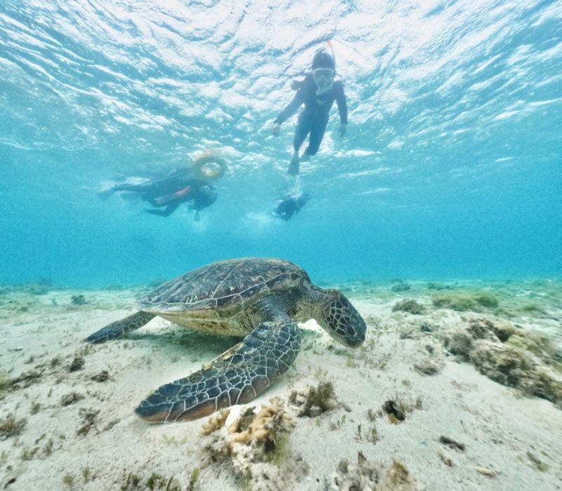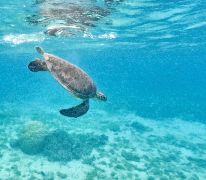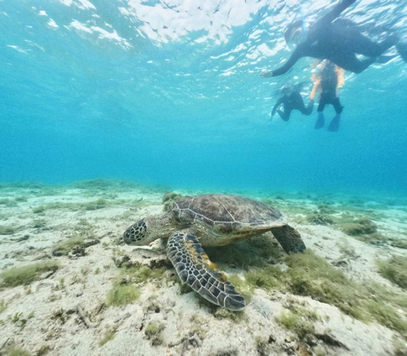 もともと濡れるアクティビティということもありますが、海が荒れてないかぎりは雨が降ってもご案内できます。ウミガメシュノーケルで見ることのできるウミガメはアオウミガメです!あまり波の影響を受けない浅いリーフの上で過ごしており、雨が降っていてもいつもと変わらずに過ごしてます。のんびりと過ごしているので僕らもウミガメになった気分で水面からゆっくり観察してます♪