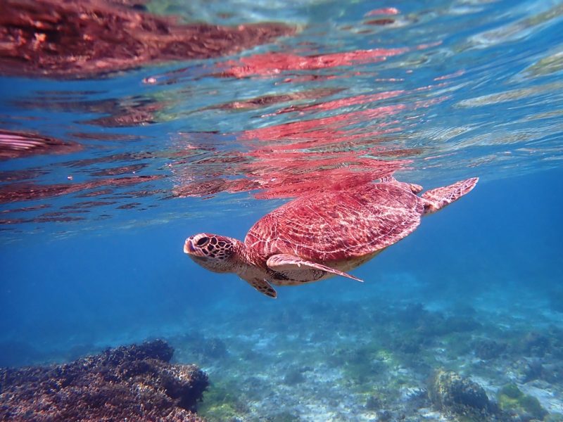 水面に映り込むカメの甲羅と、太陽の光が反射するキラキラとした景色…。この幻想的な光景は、シュノーケリングだからこそ間近で見られる特別な瞬間です。