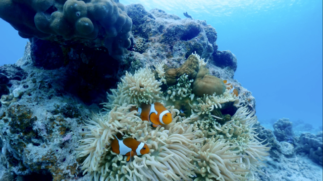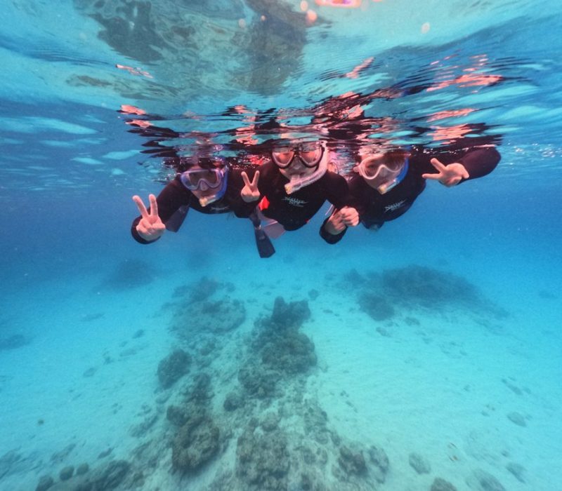 本日ご参加いただいた皆様、ウェットスーツに身を包み、準備万端で水中散歩を楽しまれていました。 水中カメラを向けると、浮遊感を楽しみながらの余裕のピースサイン!透明な水のおかげで、皆さんの楽しそうな表情がはっきりと映し出されました。
