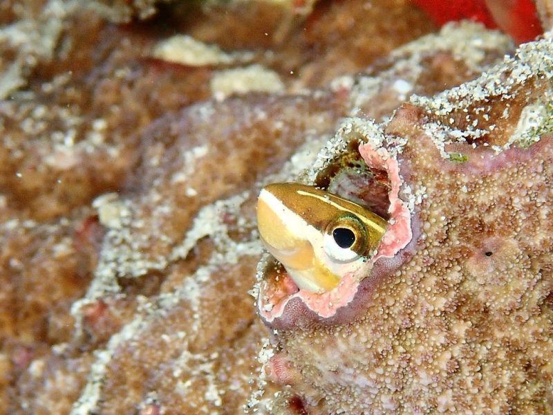 まずはこのポイントのアイドル、ジョーフィッシュことホシカゲアゴアマダイ♪巣穴から顔を出してキョロっとした目がチャーミングな子です!この可愛らしい見た目だけではなく、この子が人気の理由はとても人馴れしているためカメラを近づけてもなかなか引っ込みません!カメラダイバーには嬉しいジョーフィッシュですね。ご興味ある方はぜひリクエストを♪