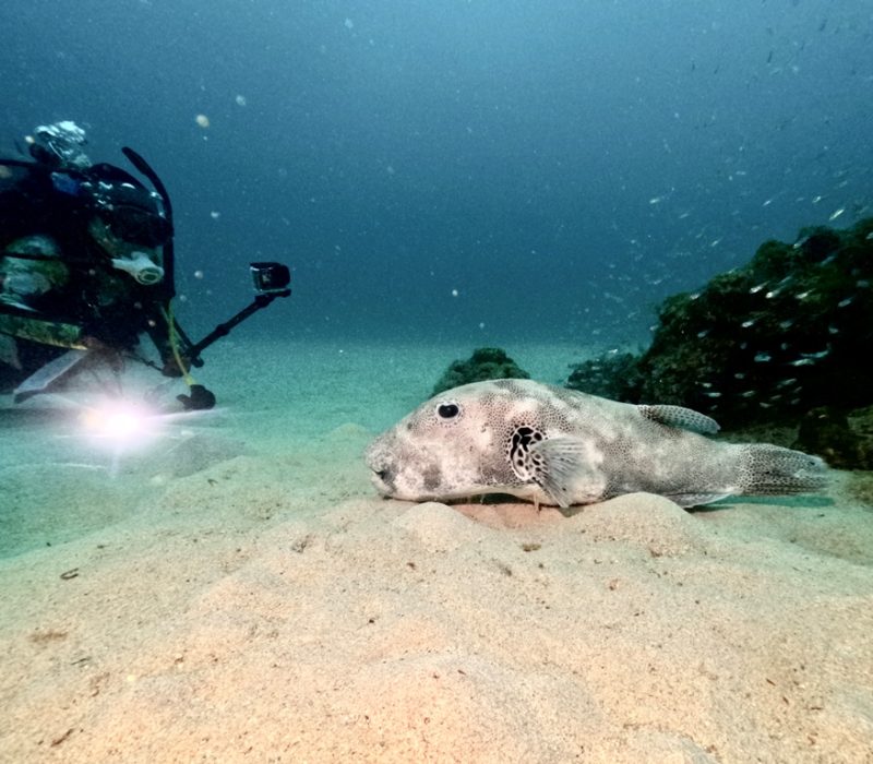 そして砂地に寝そべっていたのは山本くんこと、大きなモヨウフグ!とても人懐っこい子で、もともとは”山本SP”というポイントによく現れていたので山本くんというニックネームが付いてますが、最近は湾内のポイントに神出鬼没で現れ、今日はリッラクスガーデンに遊びに来てたみたいです。かなりリラックスしている様子。ダイバーが近くにいてもお構いなしという感じでした。ポイント名が”リラックス”と付くだけあってもしかしたら山本くんもお気に入りの休憩ポイントなのかもしれませんね♪今日も可愛らしい生き物に出会うことができました!明日はどんな出会いがあるか楽しみです!