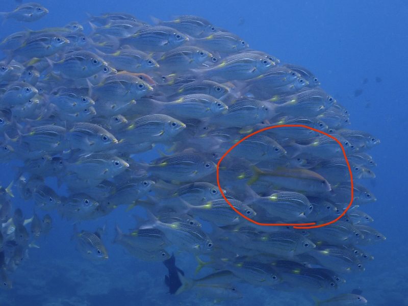 正解はアカヒメジがひっそり一緒になって群れていました♪色が違うのでわかりやすいですよね😂