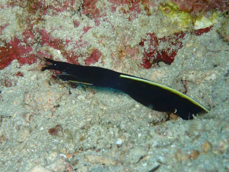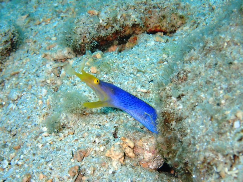 帰り際にハナヒゲウツボの幼体がいました。「幼魚は黒で、成魚は綺麗なブルーなんですよ~」って話をしましたら、お客様はご覧になった事がないそうで「そうなんだ~」、「じゃ次は成魚見に行きましょ~」となりまして、倉崎ビーチへ。
