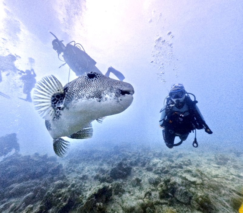 最近笠利方面のポイントで出現しておりますモヨウフグ。人懐っこい動きでお客様の目の前を泳いでくれます。