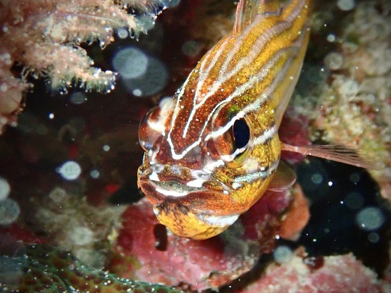 コブシメ・ミステリーサークル(アマミホシゾラフグ)の産卵行動が見所ですが、クマノミやスズメダイ、イシモチ系の魚たちも産卵行動中です!キンセンイシモチはオスが口の中で卵を育てるマウスブリーダーという生態の魚です。メスが産んだ卵の塊を、オスが孵化するまで自分の口に入れて守ります。卵をくわえている数日間、オスはエサを食べることができず、絶食状態で過ごします。結構過酷な環境のイクメンです。卵で口が大きく膨らむため、口内保育をしていない個体と比べて明らかに顔つきが違っていて「あごが異様に膨らんでいる個体」を探すと、口の中で卵を咥えている姿が観察できます!皆様もぜひ探してみてくださ~い。